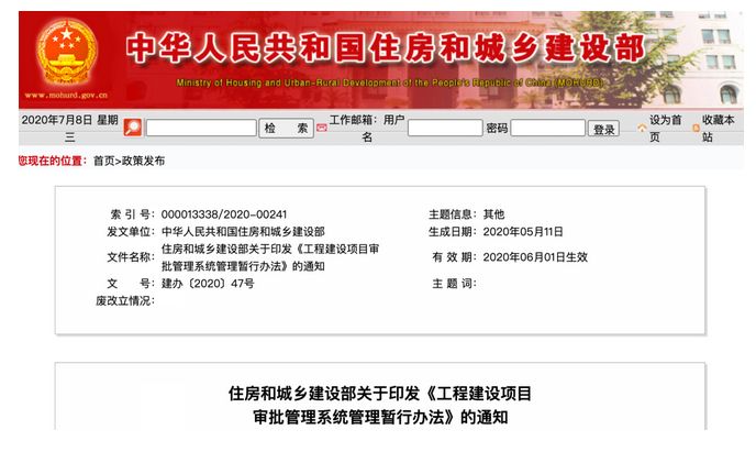 注:住建部《工程建设项目审批管理系统管理暂行办法》(建办〔2020〕47号)明确: